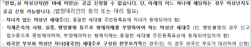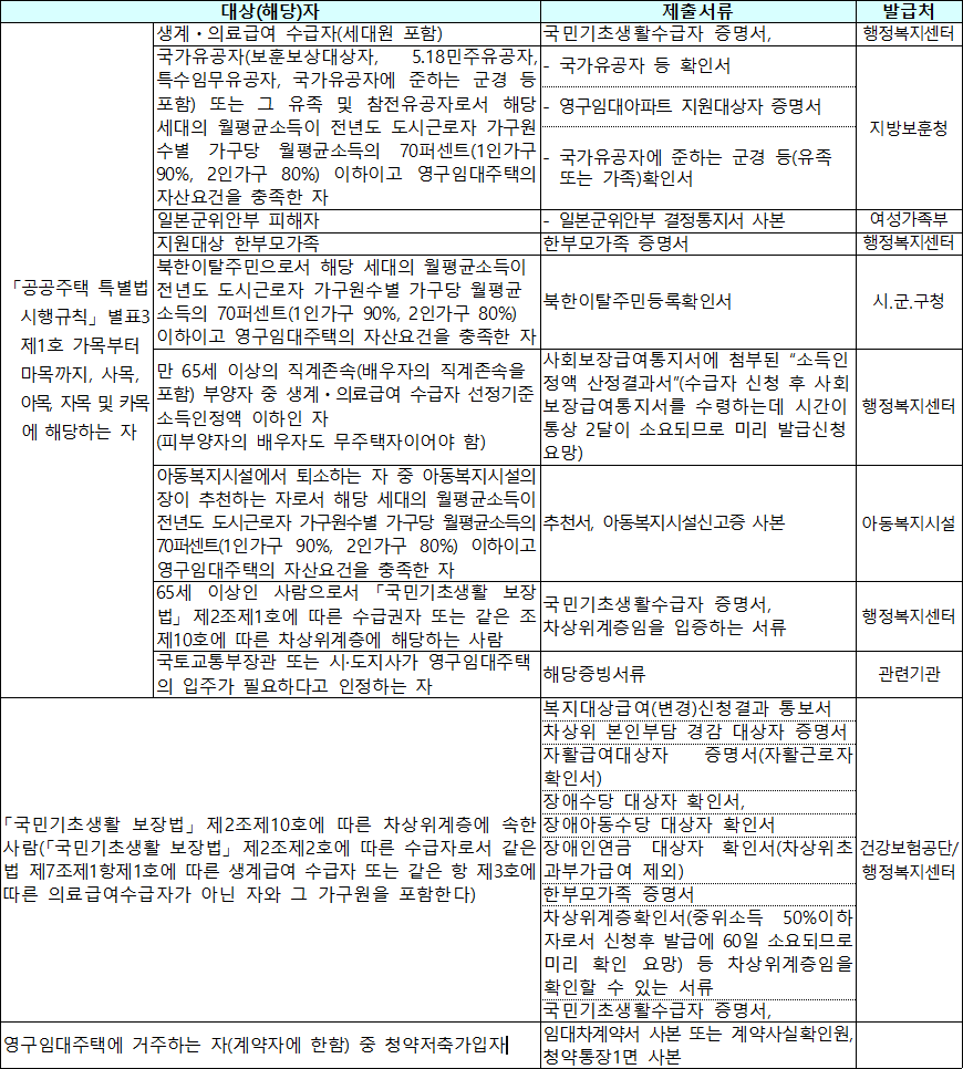 ③ 신청시 필요서류 : 장애인 수첩 사본, 국가유공자증 사본, 보훈보상대상자증 사본, 지원대상자확인원, 진단서 등 기타 증명서류 (세대원 중 장애인이 있는 경우에 한함)