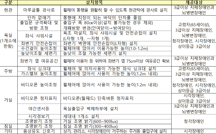 장애인의 편의증진을 위해 최초 입주자 본인 또는 부양가족 중 1명 이상이 제공대상에 해당하는 경우 신청자에 한하여 대상에 따라 아래 편의시설을 무료로 설치하여 드립니다.