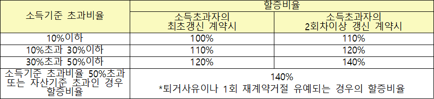 ※ 소득기준 초과 또는 자산기준 초과에 따른 할증은 갱신계약시 인상되는 비율 (연5%이내)을 반영한 금액에서 할증됩니다.