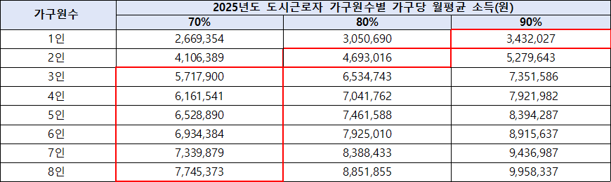 소득기준월평균소득의 70%이하 (1인가구 90%, 2인가구 80%)